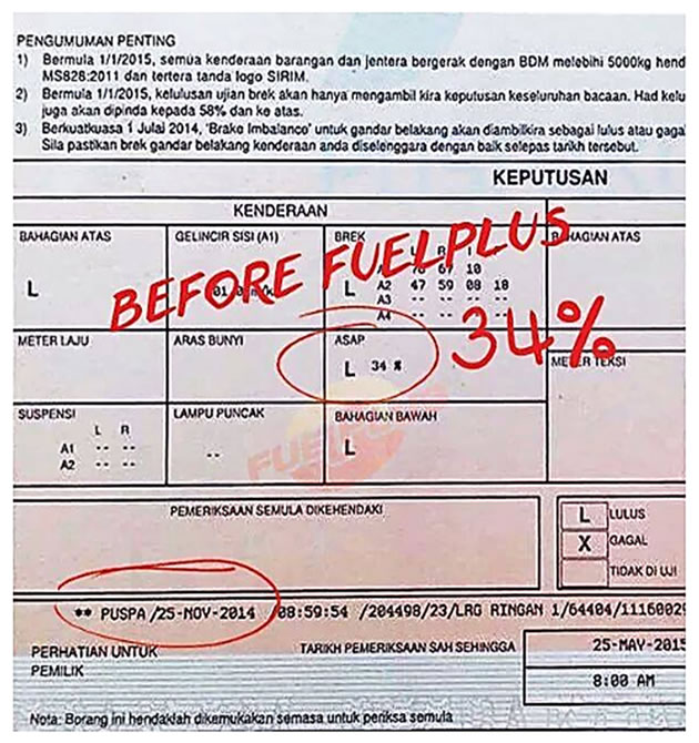 As tested by PETRONAS RESEARCH, FuelPlus has been shown that when added to fuel will not cause any adverse side effect, this is confirmed by the above” no-harm” test report as per ASTM D665/A, ASTM D381, ASTM D 1094, ASTM D 2699, ASTM D2700 and ASTM D 86.