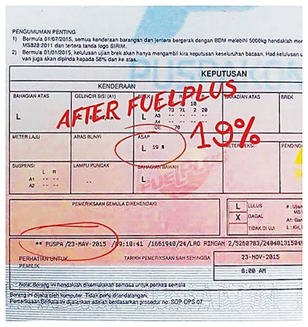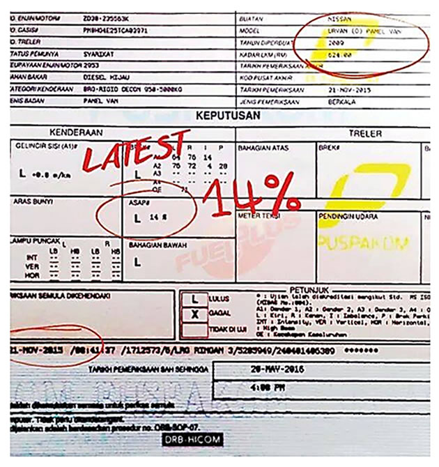 The following exhaust emission test was conducted by Pusat Pemeriksaan Kenderaan Berkomputer (PUSPAKOM), this is a Malaysian computerized vehicle inspection company owned by DRB-HICOM. It was established in 1994. Puspakom is the main inspection center for commercial vehicles throughout Malaysia.