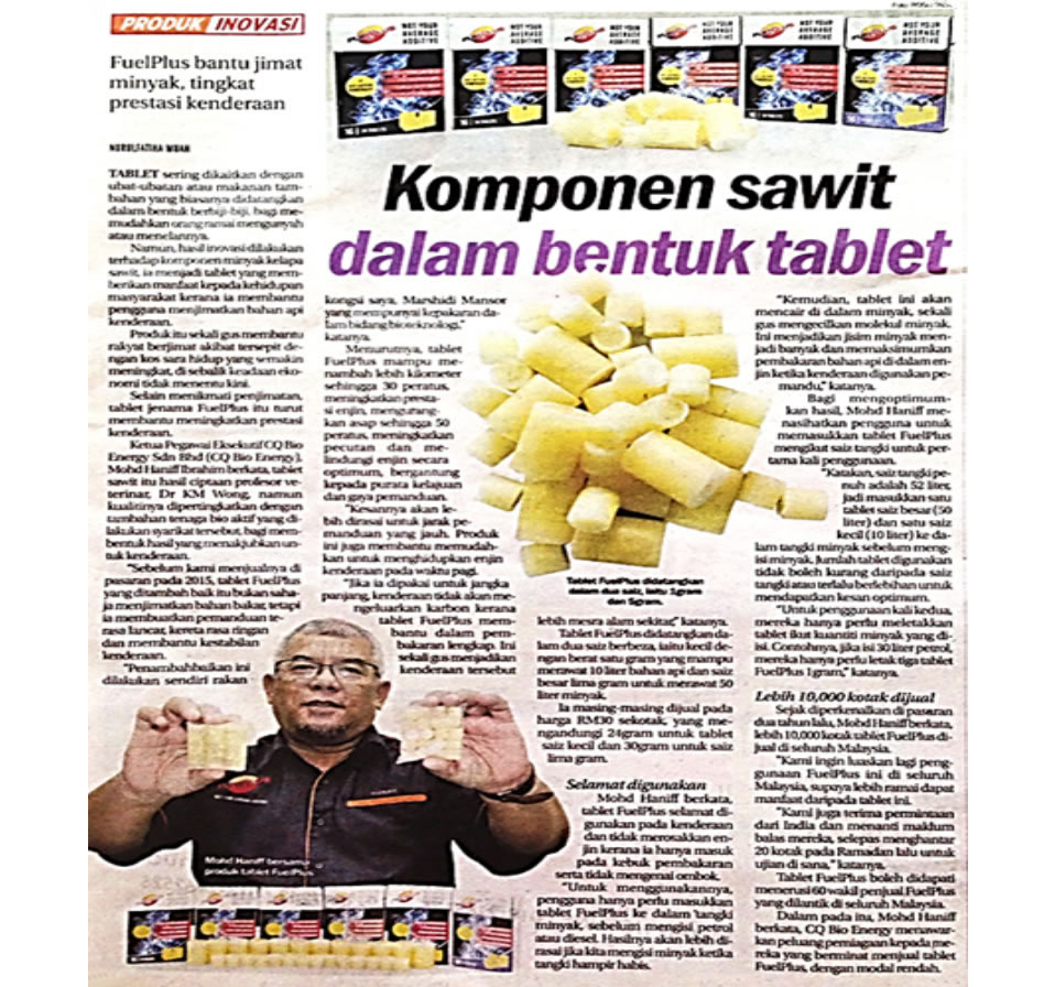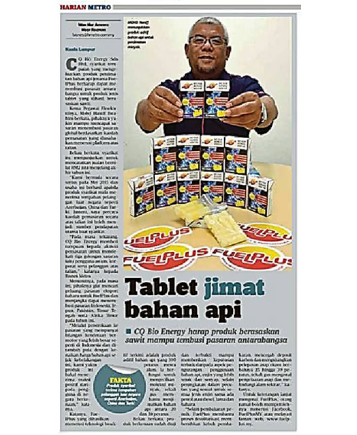 FuelPlus adalah bahan tambahan bahan api revolusioner yang diperoleh daripada minyak sawit Malaysia dalam bentuk tablet untuk jentera automotif yang beroperasi menggunakan PETROL atau DIESEL, ia tidak mudah terbakar dan mesra alam.